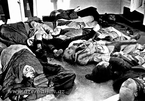 亚美尼亚的武装组织在步兵团的军事力量支持下,对居住在霍贾利的市民进行了残忍的大屠杀。结果如下:613人被杀,其中有63名儿童、106名妇女和70名老人.8个家庭完全被毁.25名儿童失去双亲.130名儿童失去了父母之一.487人受伤,其中有76名儿童.1275人被俘.150人在军事行动中失踪.对该国以及市民的个人财产造成的损失不可估量。总损失相当于五十亿(马纳特)(按照1992年1月4日的价格计算)。